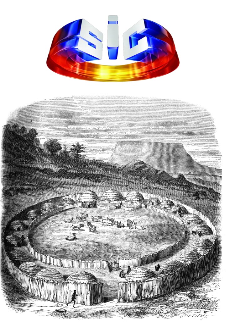 ○ fig. 4 is a woodcut from JG Wood’s The Natural History of Man, published in 1868. The image was engraved by the Dalziel Brothers,who also worked on John Tenniel’s illustrations for Lewis Carroll’s Alice in Wonderland. The settlement is described as a Zulu “Kraal”, a word I first assumed to be of African origin but later learned to be an Afrikaans word derived from the Portuguese “Curral” [an enclosure for animals]. This is a consequence of Portuguese colonialism.The Zulu word is isibaya, a term with a broader meaning: homestead, place for worship, etc.