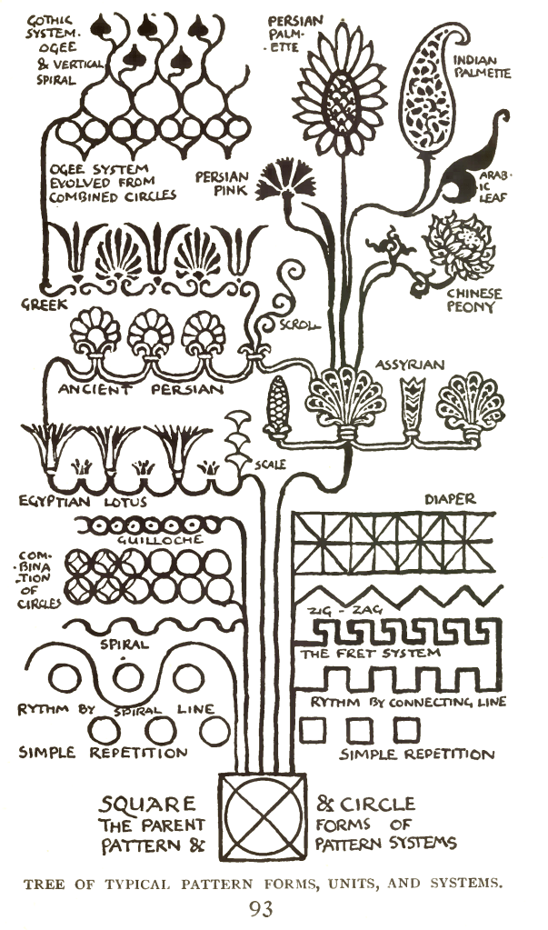 Taxonomies of different symbols were organised according their formal characteristics, their geographic, chronologic, or ethnic origins. This process is very clearly detailed in works such as Owen Jones’s The Grammar of Ornament (1856), in which ornaments appropriated from many cultures are presented as a grammar (fig. 5), or Walter Crane’s Line and Form (1900), where they are presented as a genealogical diagram (fig. 6).