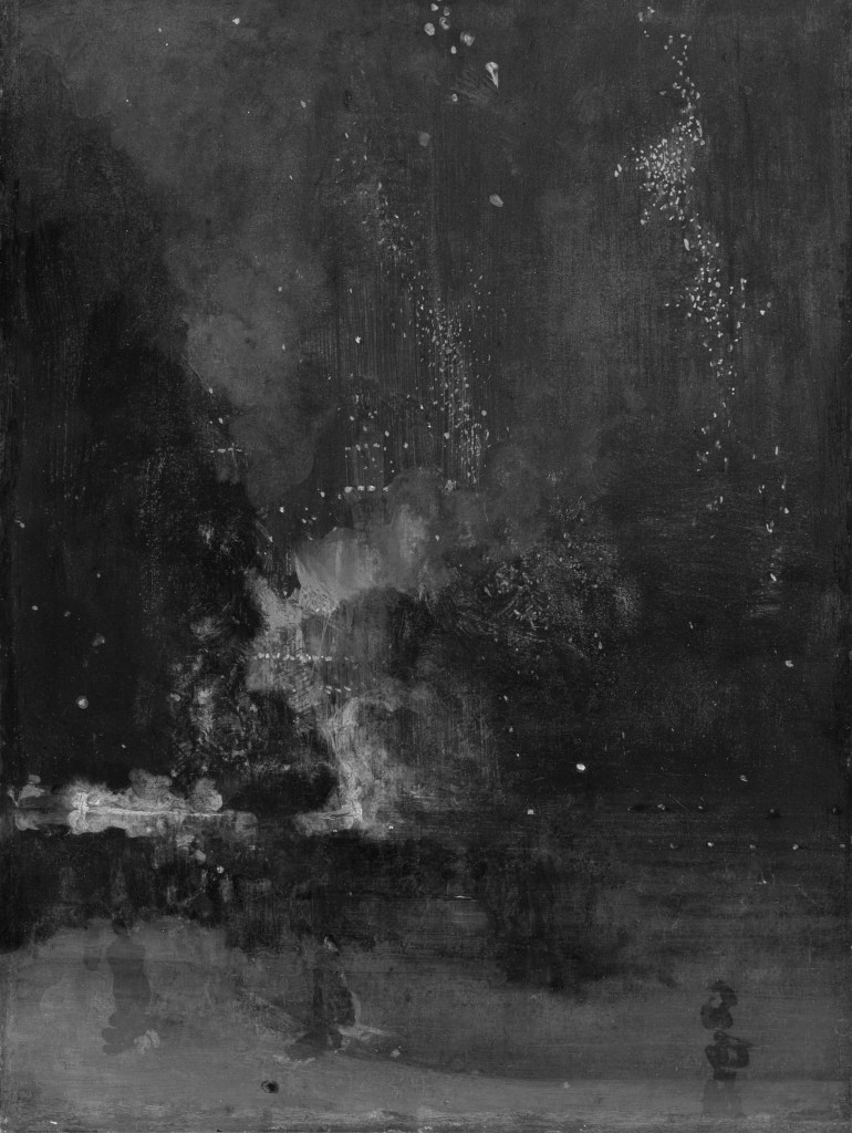 This emphasis on the two-dimensional and non-representational character of painting would only gain terrain during the second half of the 19th century. Whistler himself invested in increasingly bold attempts on abstraction. In 1877, when he presents his Nocturne in Black and Gold – The Falling Rocket (fig. 8), critic John Ruskin accuses him of “flinging a pot of paint in the public’s face”, to which the painter responded with a libel lawsuit — which he won.6 All of this would culminate in the abstract movements of the early-20th century.