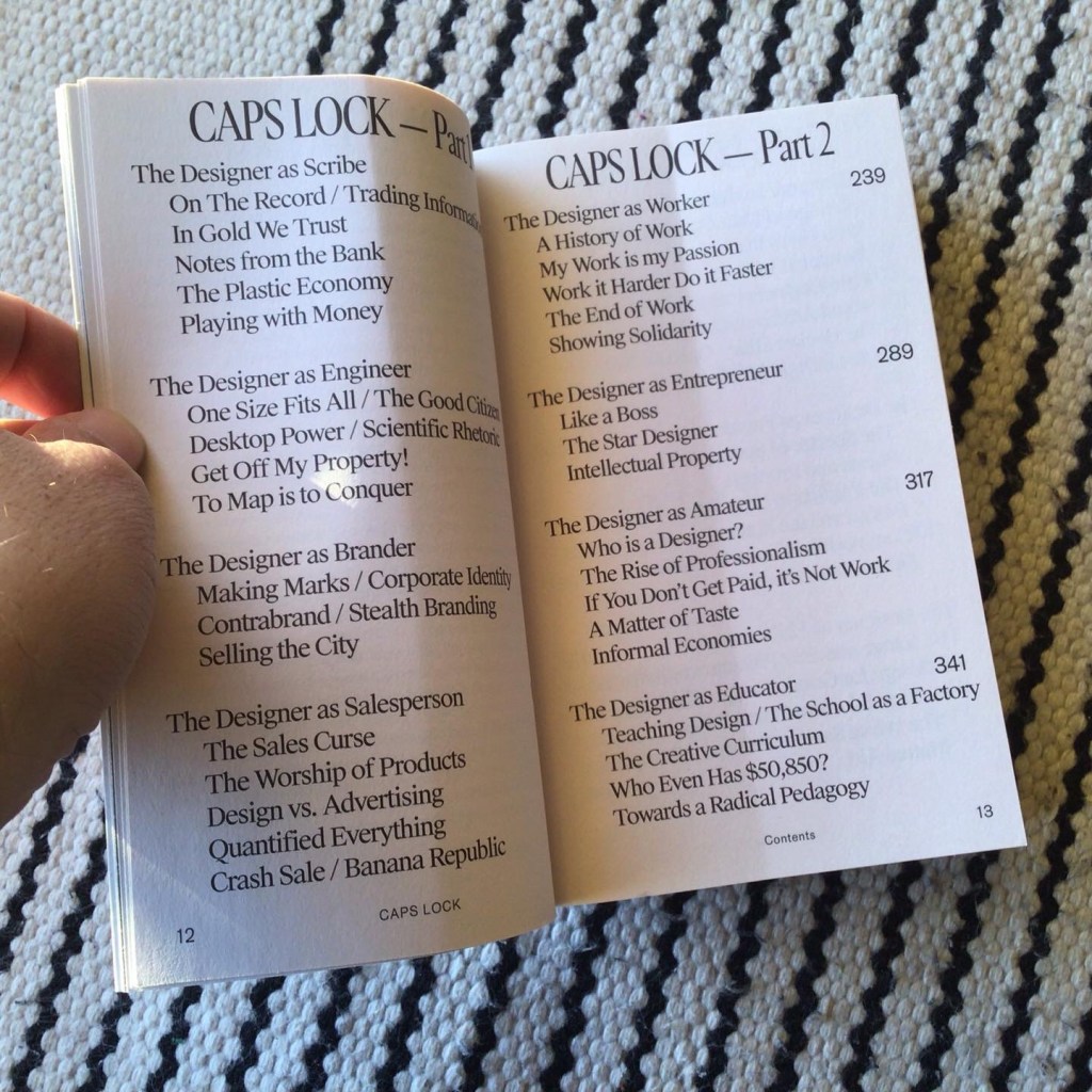 I enjoyed Ruben Pater’s Politics of Design. Pater has a knack for engagingly weaving ideas from a vast array of sources. Now I’m reading Caps Lock, his big book on Design and capitalism. It will be a welcome addition to the bibliography of my design criticism course.